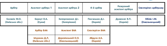 Главным арбитром встречи назначен Николай Балакин из Киевской области. Боковыми судьями станут Александр Беркут из Сум и Дмитрий Запороженко из Запорожья. Четвертый арбитр – Дмитрий Панчишин (Харьков).