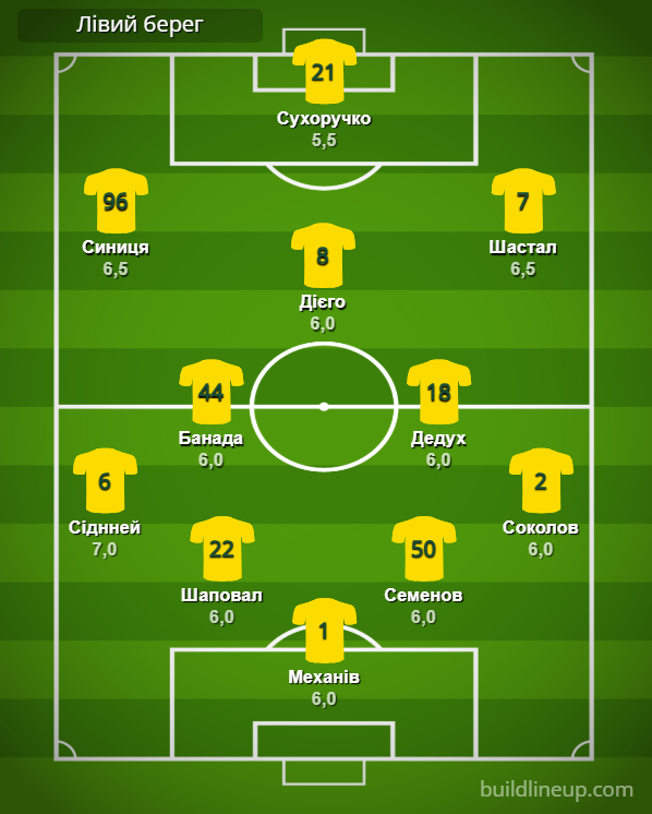 «Левый Берег»: Механов – Сидней, Шаповал, Семенов, Соколов (Войцеховский, 60) – Банада, Диего, Дедух – Синица (Галас, 84), Сухоручко, Шастал.