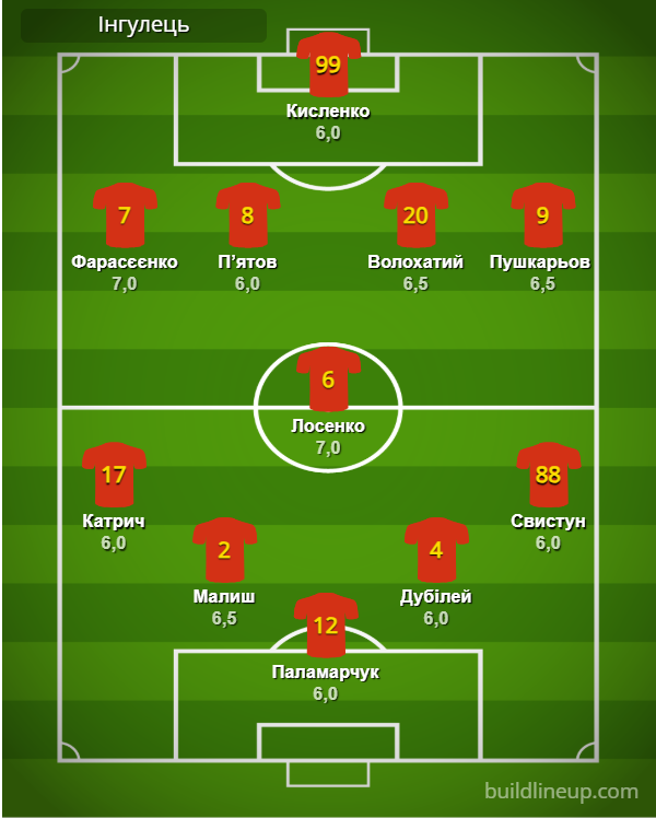 «Ингулец» (замены): Дихтярук – 6,0, Лисняк – б/о, Гаджук – б/о, Могильный – б/о, Сад – б/о.