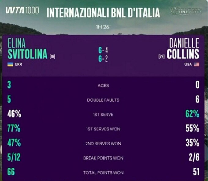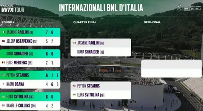 В четвертьфинале соревнований в столице Италии Свитолина поборется против еще одной представительницы США Пейтон Стернс, которая ранее в своем поединке 1/8 финала одолела Наоми Осаку.
