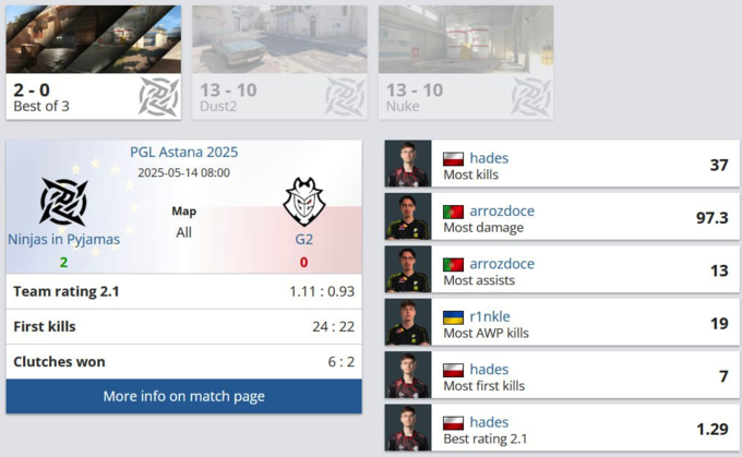 Ninjas in Pyjamas обеспечили себе место в плей-офф турнира PGL Astana после победы над G2 в пятом раунде швейцарской системы. Этот успех совпал с важной новостью – основной игрок команды, украинец Артем «r1nkle» Мороз, подписал новый контракт с клубом до 2028 года.