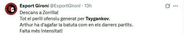 Jonay Amaro: Цыганков проявил мужество и стал ключевым в прорыве Жироны перед голом Стуани. Конечно, он не был блестящим, но обладал смелостью попытаться заставить все работать. Игра для снятия психологического бремени.