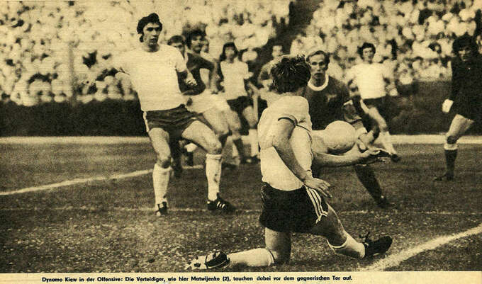 Но выходим в поле. Как только прошел дождь, скользко. И едва матч начался, как Бернд Никель пробил слева – 1:0. Первая минута. В этот момент вспомнил о высказываниях немцев, которые нам читали перед матчем. «Точно будет штук пять», - подумал. Заполненный стадион ревет, горят файеры – где-то жутко стало. Но постепенно из шокового состояния вышли, еще в первом тайме Володя Онищенко счет сравнял. Когда же во втором тайме судья назначил пенальти за то, что я придержал Хельценбайна, против которого играл персонально, мы оставались спокойными, хотя во второй раз в матче проигрывали. В конце игры даже победу вырвали благодаря голам Блохина и Мунтяна. Володя тогда хорошо издали приложился. Мяч скользнул по мокрому полю и вошел в ворота.