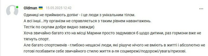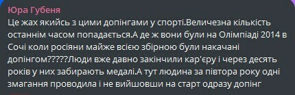 Юра Губеня: Это ужас какой-то с этими допингами в спорте. Огромное количество в последнее время попадается. А где же они были на Олимпиаде 2014 в Сочи, когда россияне почти всей сборной были накачаны допингом? Люди уже давно закончили карьеру и через десять лет у них забирают медали. А здесь человек за полтора года одни соревнования проводил и не выйдя на старт сразу допинг.