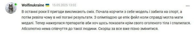wolfinukraine: В последние годы ее приключения вызывают смех. Начала корчить из себя модель и забила на спорт, а потом ревела почему у нее плохие результаты. С олимпиадой это эпик фейл, когда действительно могла иметь медали. Теперь нажралась препаратов, чтобы хоть что-то показать кроме своего обнаженного тела и погорела. Совершенно нет сострадания к такому человеку. Скорее всего, уже поздно измениться.