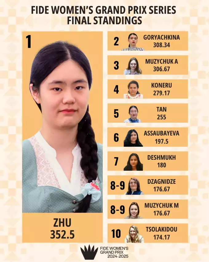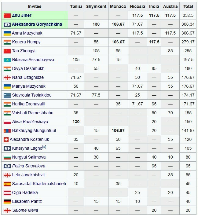Итоговый зачет Гран-при: 1. Чжу Цзиньэр (Китай) – 352,5; 2. Александра Горячкина (FIDE) – 308,34; 3. Анна Музычук (Украина) – 306,67