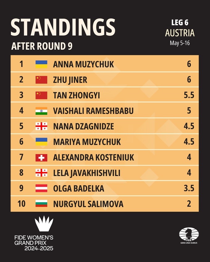 Раньше Анна в Тбилиси поделила 3–5 места, а затем выиграла этап в кипрской Никосии. Ее сестра Мария Музычук завершила турнир в Австрии на 6-й позиции, набрав 4,5 очка из 9.