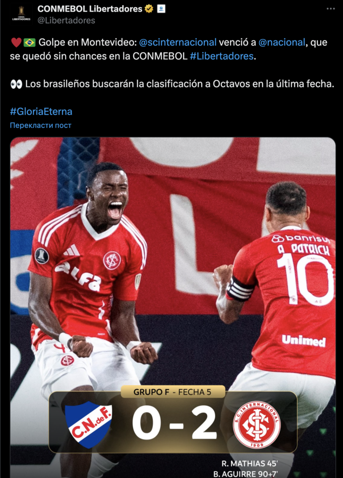 В другом матче бразильский Интернасьонал на выезде победил уругвайский Насьональ со счетом 2:0.