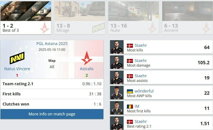 Команда Astralis продолжила свою неожиданную победную серию на турнире PGL Astana, обыграв Natus Vincere со счетом 2:1. Победы на картах Nuke (16:13) и Ancient (13:6) обеспечили датчанам место в полуфинале, несмотря на поражение на Mirage (8:13).