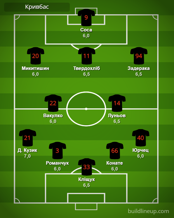 «Кривбасс»: Клищук – Д. Кузык, Романчук, Конате, Юрчец – Вакулко, Лунев (Икенна, 68) – Микитишин (Ндомбази, 68), Твердохлеб, Задерака (Понедельник, 77) – Соса.