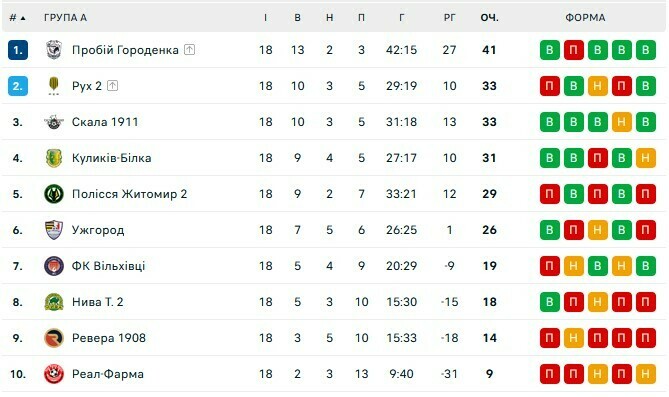 «Скала 1911» со счетом 7:0 разгромила «Реал Фарму» и заняла в турнирной таблице третье место. А вот «Рух-2», несмотря на поражение 0:4, остался вторым.
