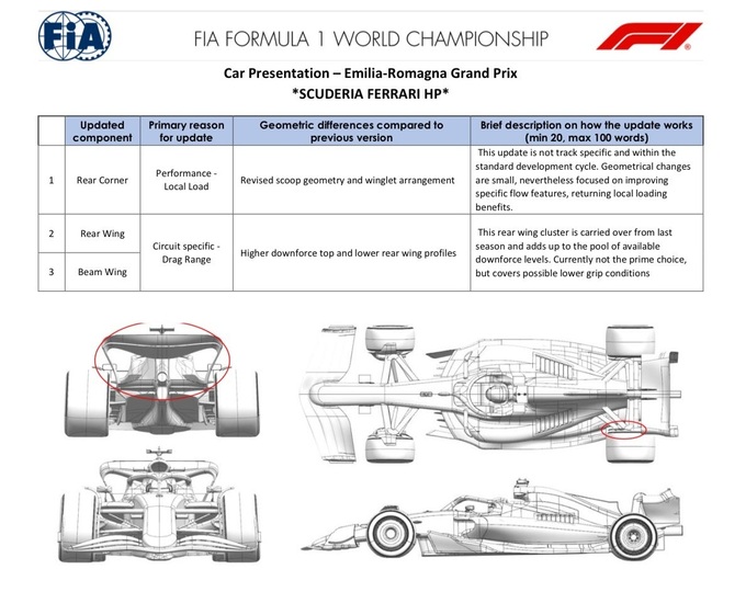 Скудерия из Маранелло привезла в Италию пакет обновлений, ориентированных на увеличение уровня прижимной силы. В частности, было представлено высоконагруженное заднее антикрыло и соответствующее бим-крыло, а также обновленную конструкцию воздуховодов задних тормозов. Такие нововведения должны подготовить болид к трассам, где критической является эффективная работа задней оси в условиях высоких нагрузок.