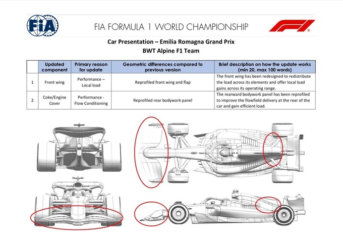Французская команда сосредоточила внимание на передней части болида. Новое переднее крыло получило измененное распределение нагрузки между секциями, что позволяет гибко настраивать баланс между прижимной силой и аэродинамическим сопротивлением, в частности на трассах с длинными прямыми участками.