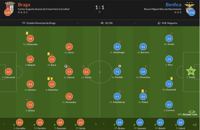 Украинский кипер «Бенфики» Анатолий Трубин провел на поле весь матч, пропустил 1 гол и совершил 6 сейвов. Статистические порталы SofaScore и WhoScored оценили его игру в 8.2 и 7.8 баллов.