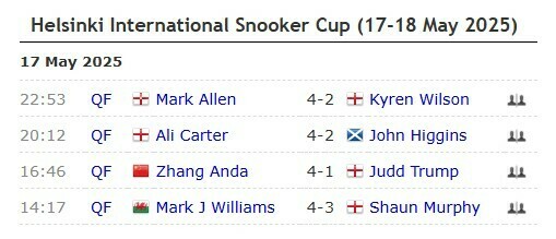 - Кайрен Уилсон (Англия) – Марк Аллен (Северная Ирландия) – 2:4