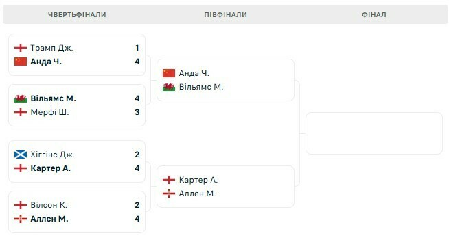 Полуфиналы: Чжан Анда – Марк Уильямс, Али Картер – Марк Аллен