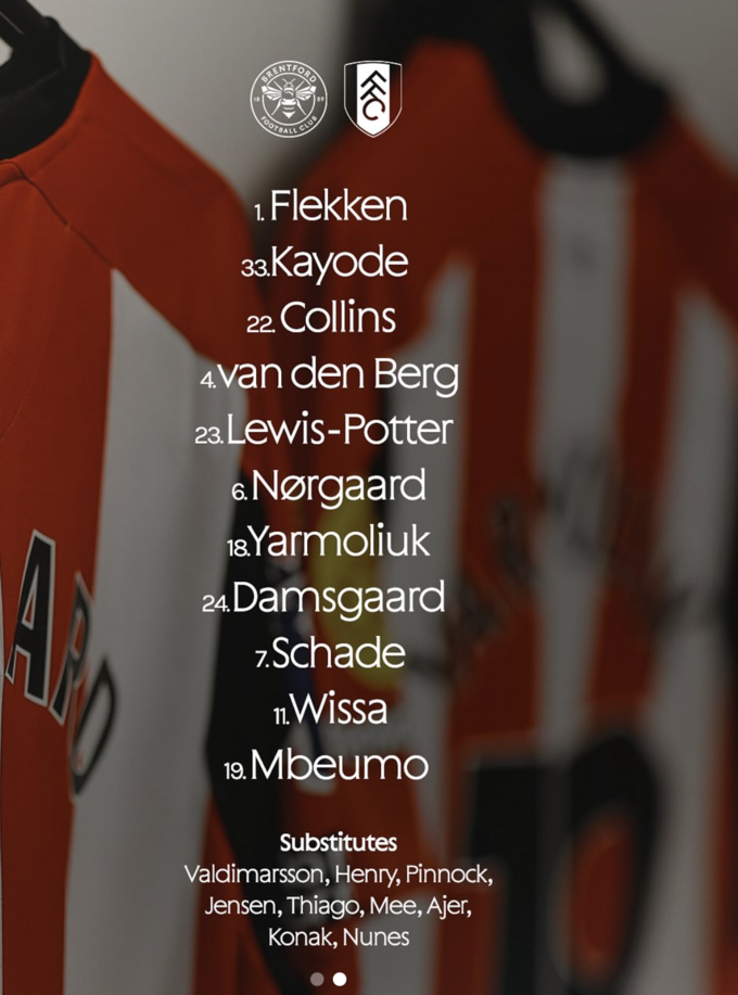 Брентфорд: Флеккен, Кайоде, Коллинз, ван ден Берг, Льюис-Поттер, Нергор, Ярмолюк, Мбемо, Висса, Дамсгор, Шаде