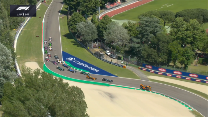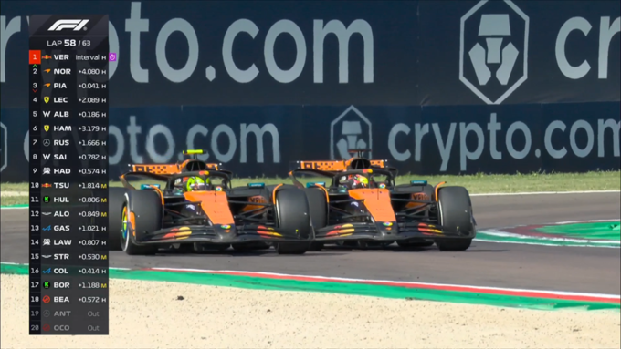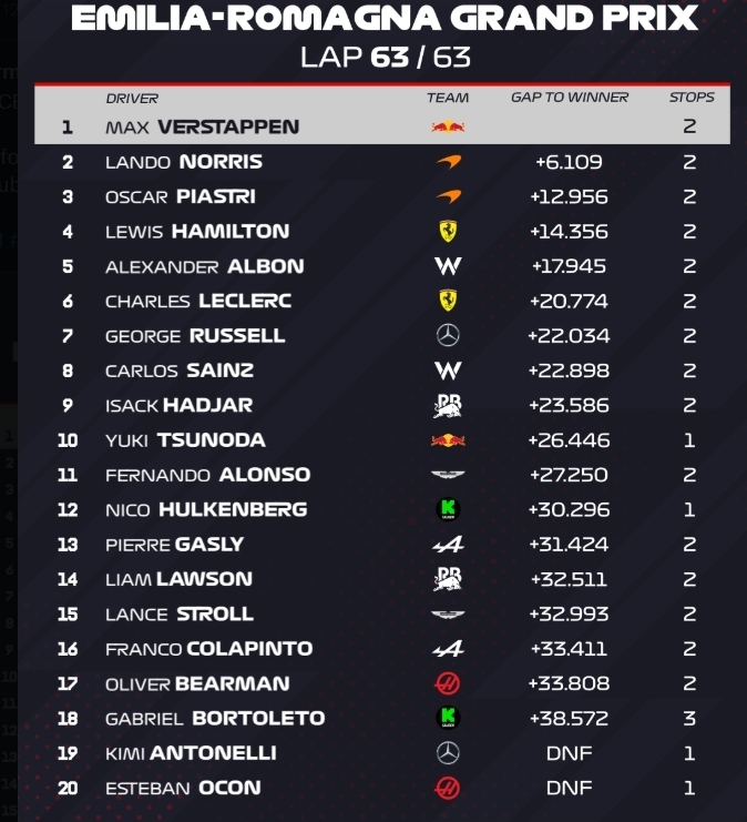 В конце гонки из-за технических проблем сошел местный любимец Андре Кими Антонелли, что вызвало сейфити-кар. Это собрало всех пилотов, но Ферстаппен не позволил Пиастри навязать борьбу, а сам Оскар проиграл Норрису. У австралийца были старые шины, он не сумел остановить напарника.