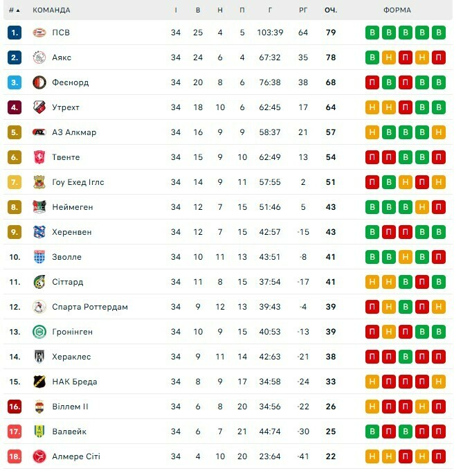 Итоговая таблица. ПСВ стал чемпионом Нидерландов, опередив Аякс