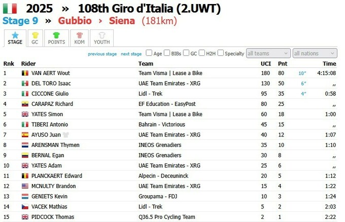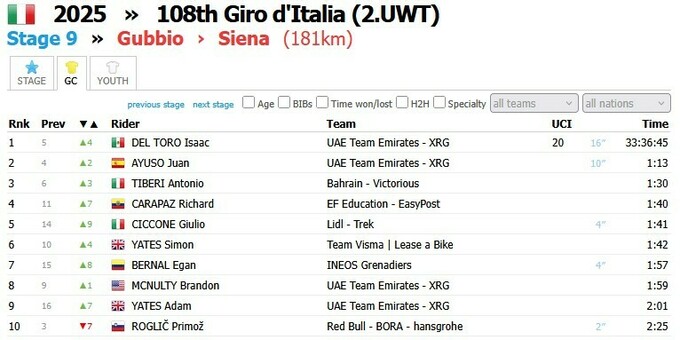 После девятого этапа лидером генеральной классификации стал Исаак Дель Торо. Мексиканец сместил с первой позиции итальянца Диего Улисси.