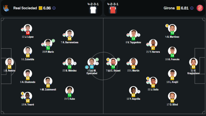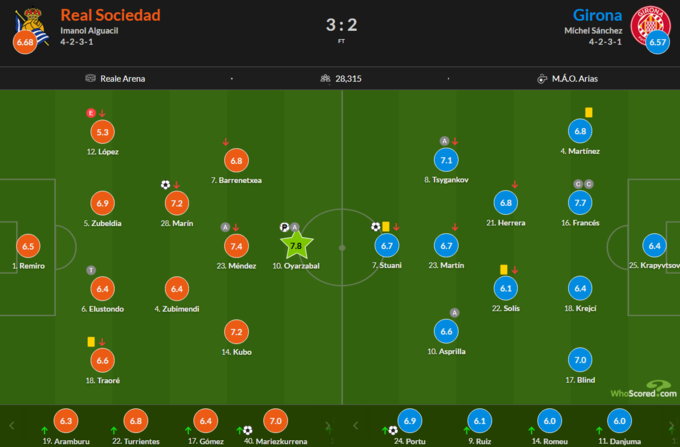 Лучшим по версии обоих порталов стал нападающий хозяев поля Микель Оярсабаль, который отличился голом, ассистом и получил оценки 8.0 и 7.8 баллов соответственно.