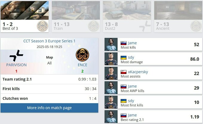 Dust2 уверенно ушёл в копилку PARIVISION, поэтому всё решалось на Ancient, где ENCE показали доминирующую игру на КТ-стороне и без особых проблем довели матч до победы в атаке.