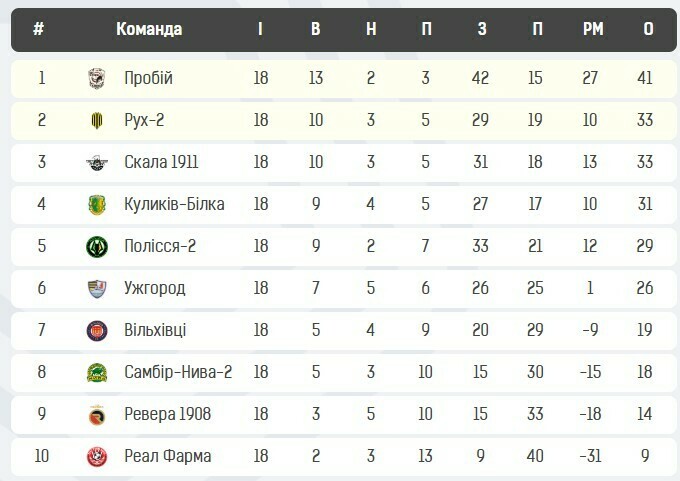 Итоговая таблица Второй лиги. Рух-2 отказался от стыковых матчей