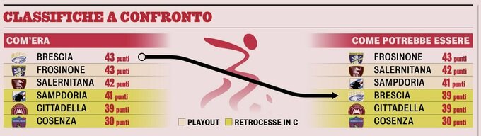 По этой причине Брешия вылетит в низший дивизион напрямую, Сампдория получит шанс сыграть в стыках с Салернитаной, а Фрозиноне останется в Серии B, и ему не придется играть дополнительные матчи.