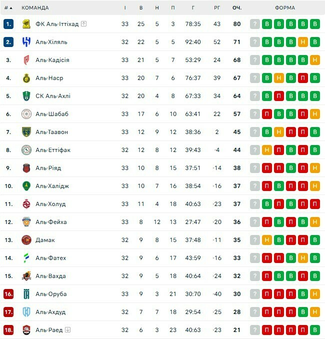 Турнирное положение: Аль-Иттихад (80 очков), Аль-Хиляль (71), Аль-Кадисия (68), Аль-Наср (67), Аль-Ахли (64), Аль-Шабаб (57).