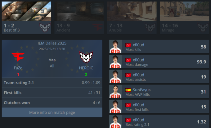 Heroic и FaZe Clan разменялись пиками – Ancient в пользу FaZe 13:9, а Anubis за Heroic 7:13. Все решалось на Mirage, где все дошло к овертаймам, там SunPayus и компания были сильнее – 14:16.