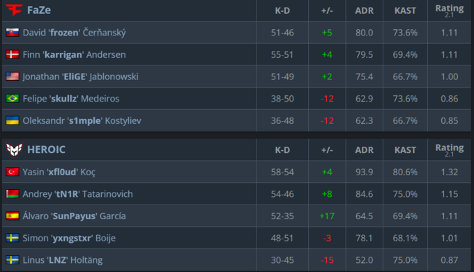 s1mple провалил матч против Heroic. Он был худшим в составе FaZe Clan, 36 киллов и 48 смертей, 0.85 рейтинг.