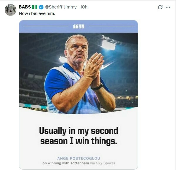 Болельщики «Тоттенхема» в восторге от победы команды. И вспоминают слова главного тренера Ангелоса Постекоглу, который заявлял, что выигрывает трофей на второй сезон пребывания в клубе.
