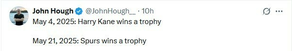 John Hough: 4 мая 2025 г.: Гарри Кейн выигрывает трофей. 21 мая 2025 г.: «Шпоры» выигрывают трофей.