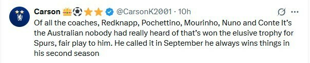 Carson: Из всех тренеров, Реднапп, Почеттино, Моуринью, Нуно и Конте, именно австралиец, о котором никто не слышал, выиграл неуловимый трофей для «Шпор», честно говоря. Он сказал это в сентябре, он всегда выигрывает в свой второй сезон.