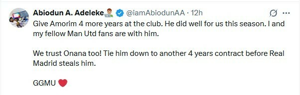 Abiodun A. Adeleke: Дайте Амориму еще 4 года в клубе. Он хорошо поработал для нас в этом сезоне. Я и мои друзья-фанаты «Манчестер Юнайтед» с ним. Мы тоже доверяем Онана! Привяжите его к еще одному 4-летнему контракту, прежде чем его украдет Реал Мадрид.