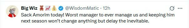 Big Wiz: Увольте Аморима сегодня! Худший тренер, который когда-либо нами руководил, и его сохранение в следующем сезоне ничего не изменит, а только отсрочит неизбежное.
