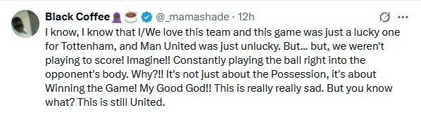 Black Coffee: Я знаю, я знаю, что я/мы любим эту команду, и эта игра была просто удачной для Тоттенхэма, а Манчестер Юнайтед просто не повезло. Но... но мы не играли, чтобы забить! Представьте себе!! Постоянно играть мячом прямо в корпус соперника. Почему?!! Дело не только во владении, дело в победе в игре! Боже мой!! Это действительно очень грустно. Но знаете что? Это все еще United.