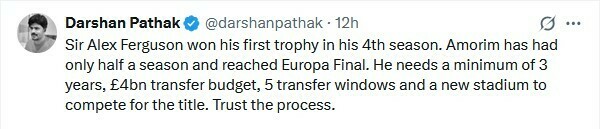 Darshan Pathak: Сэр Алекс Фергюсон выиграл свой первый трофей в 4-м сезоне. Аморим провел только половину сезона и дошел до финала Европы. Ему нужно минимум 3 года, 4 млрд фунтов стерлингов трансферного бюджета, 5 трансферных окон и новый стадион, чтобы побороться за титул. Доверьтесь процессу.