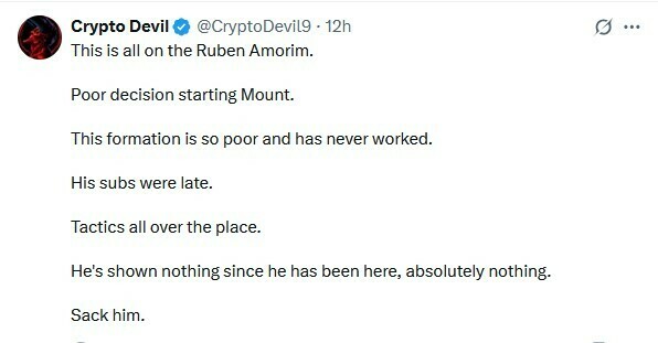 Crypto Devil: Это все из-за Рубена Аморима. Плохое решение по Маунту в старте. Эта схема так плоха и никогда не работала. Его замены опоздали. Он ничего не показал с тех пор как здесь, абсолютно ничего. Увольте его.