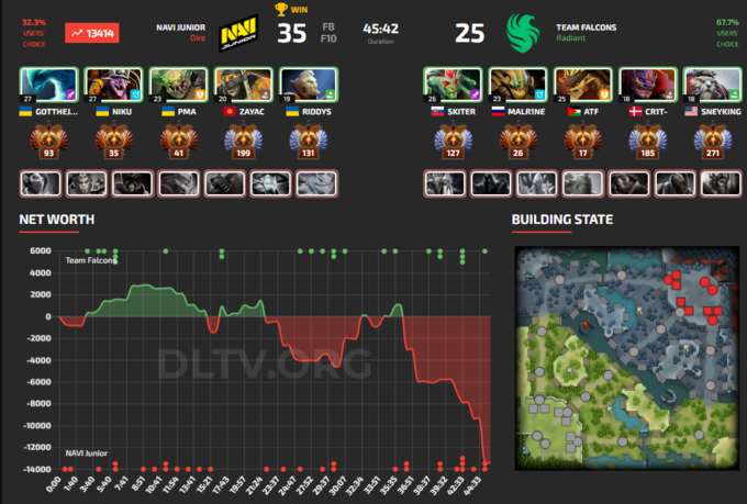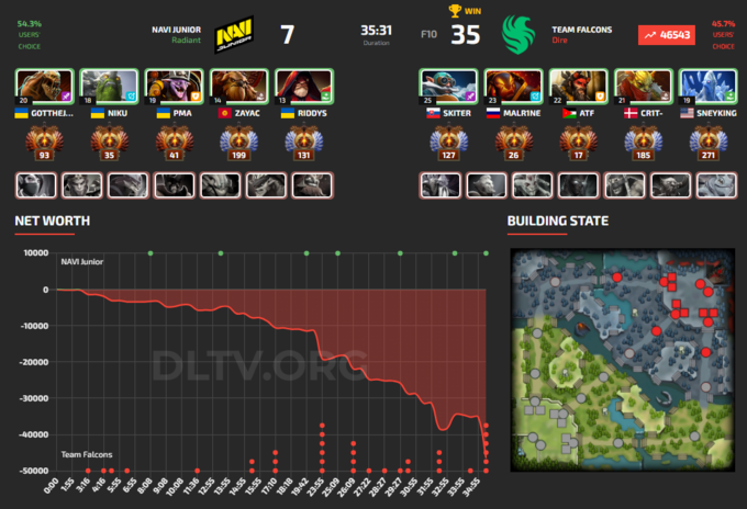 NAVI Junior показала крутую игру на первой карте и, казалось бы, подарила надежду. Замечательно там отыграл их керри Тарас «gotthejuice» Линников на Morphling (14/1/8) и Артем «Niku» Бачкур на Timbersaw – 13/2/15. Вторая карта завершилась разгромным поражением, Team Falcons отправилась в переигровки против Gaimin Gladiators.