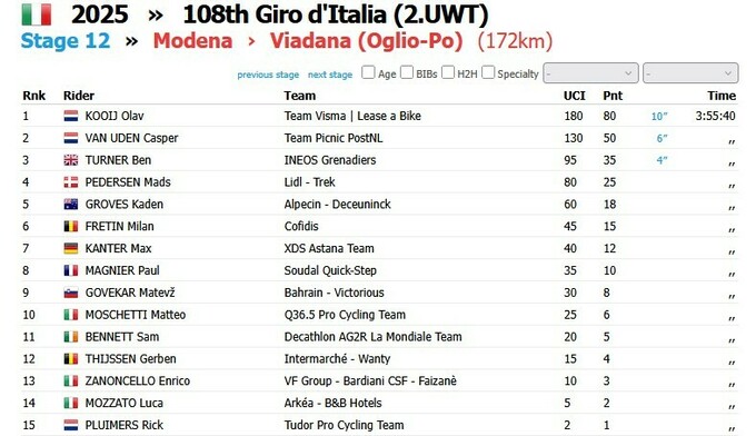 В четверг, 22 мая, прошел 12-й этап шоссейного гранд-тура Giro d'Italia 2025. Победу одержал представитель команды Team Visma Lease a Bike Олаф Кой.