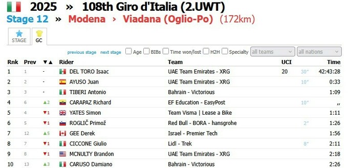 После двенадцатого этапа лидером генеральной классификации остается Исаак Дель Торо. Хуан Аюсо отстает на 33 секунды.