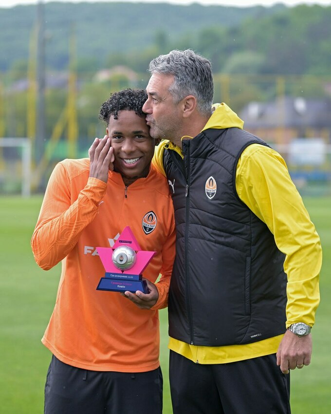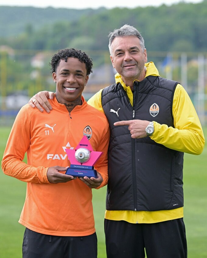 Полузащитник Кевин получил из рук наставника Марино Пушича приз лучшему игроку «Шахтера» в апреле 2025 года.