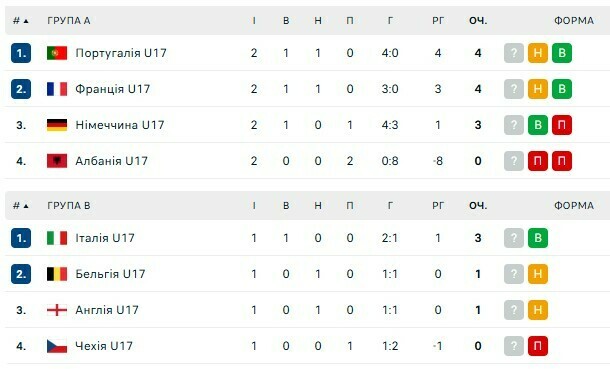 В другой группы играют: Италия (3 очка), Бельгия, Англия (по 1), Чехия (0). По две лучших команды выйдут в полуфинал.