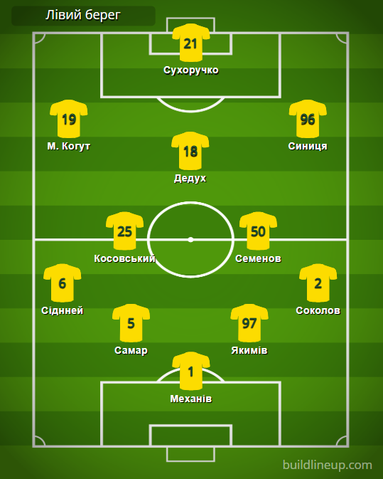 «Левый Берег»: Механив – Сидней, Самар, Якимив, Соколов (Войцеховский, 89) – Косовский (Ризнык, 77), Дедух, Семенов – Н. Когут (Диего, 54), Сухоручко (Кобзарь, 54), Синица (Шастал, 54).