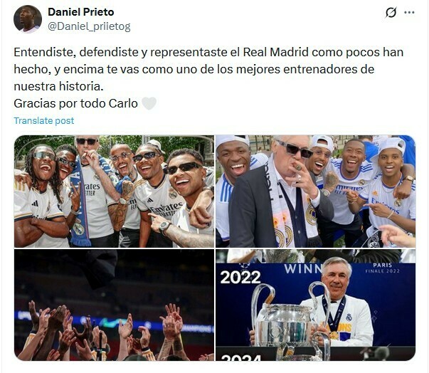 Daniel Prieto: Вы понимали, защищали и представляли Реал Мадрид как мало кто другой, и, вдобавок ко всему, вы уходите как один из лучших тренеров в нашей истории. Спасибо за все, Карло.