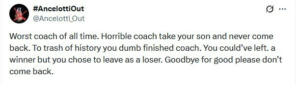#AncelottiOut: Худший тренер всех времен. Ужасный тренер, забери своего сына и никогда не возвращайся. На помойку истории, ты тупой, законченный тренер. Ты мог уйти победителем, но ты решил уйти неудачником. Прощай навсегда, пожалуйста, не возвращайся.