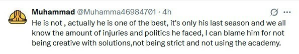 Muhammad: На самом деле он один из лучших, это всего лишь его последний сезон, и мы все знаем, с каким количеством травм и политических интриг он столкнулся. Я могу винить его за то, что он не был креативным в решениях, не был строгим и не использовал академию.