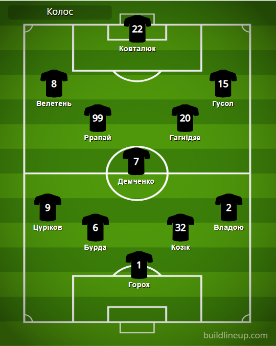«Колос»: Горох – Цуриков, Бурда, Козик, Владою (Поправка, 74) – Ррапай (Ореховский, 83), Демченко (Теллес, 46), Гагнидзе (Безручук, 88) – Велетень, Ковталюк (Сидоров, 46), Гусол (Кузык, 83).
