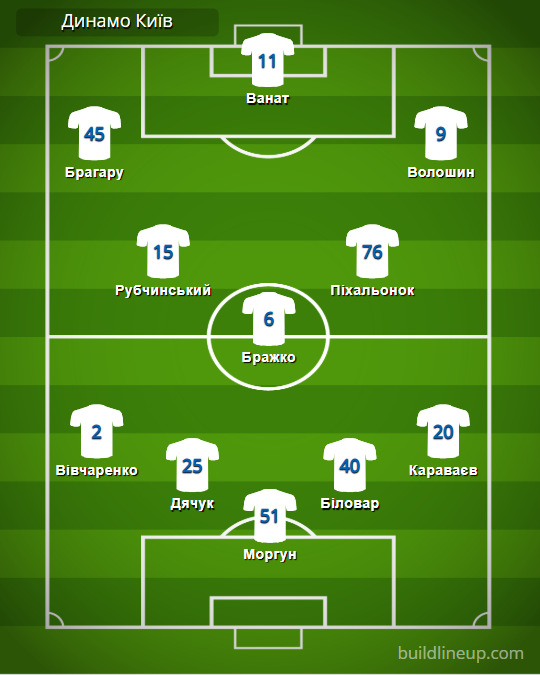 «Динамо» Киев: Моргун – Вивчаренко, Дячук, Биловар, Караваев – Рубчинский (Буяльский, 75), Бражко, Пихаленок (Шапаренко, 68) – Брагару (Кабаев, 68), Ванат, Волошин (Ярмоленко, 76).